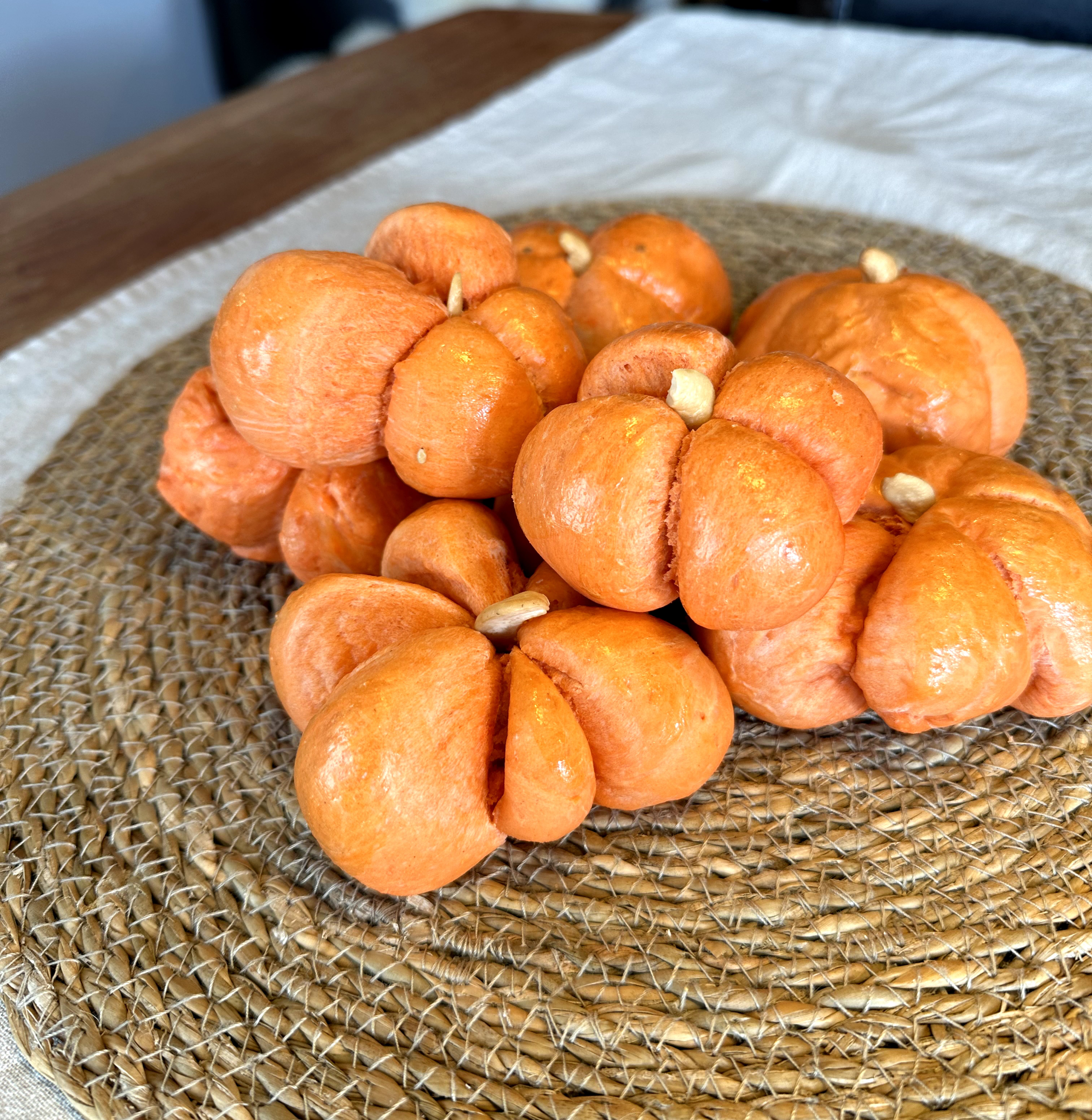 Bætið appelsínugulum matarlit saman við deigið og látið hefast. Mótið í bollur og bindið snæri 2-3 sinnum utan um hverja bollu, ekki fast þar sem að þær blása út við bakstur. Penslið með eggi og bakið. Klippið snærið af bollunum þegar þær eru fullbakaðar og stingið möndlu eða hnetu í þær miðjar eins og stilk.